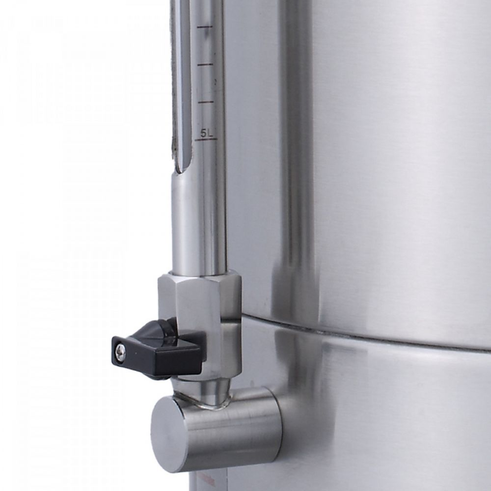 Integroitu, läpinäkyvä kiertoputki litran asteikolla ja venttiilillä; helpottaa vedenkeittimen tilavuuden ja virtauksen säätelyä