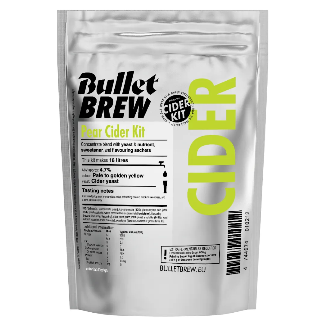 Bullet Brew -päärynäsiideri on raikas ja mehukas päärynäsiideri, jossa on virkistävä maku, keskitasoinen makeus ja pehmeä, sitruksinen happamuus. Tämä pakkaus tuottaa noin 18 litraa siideriä.