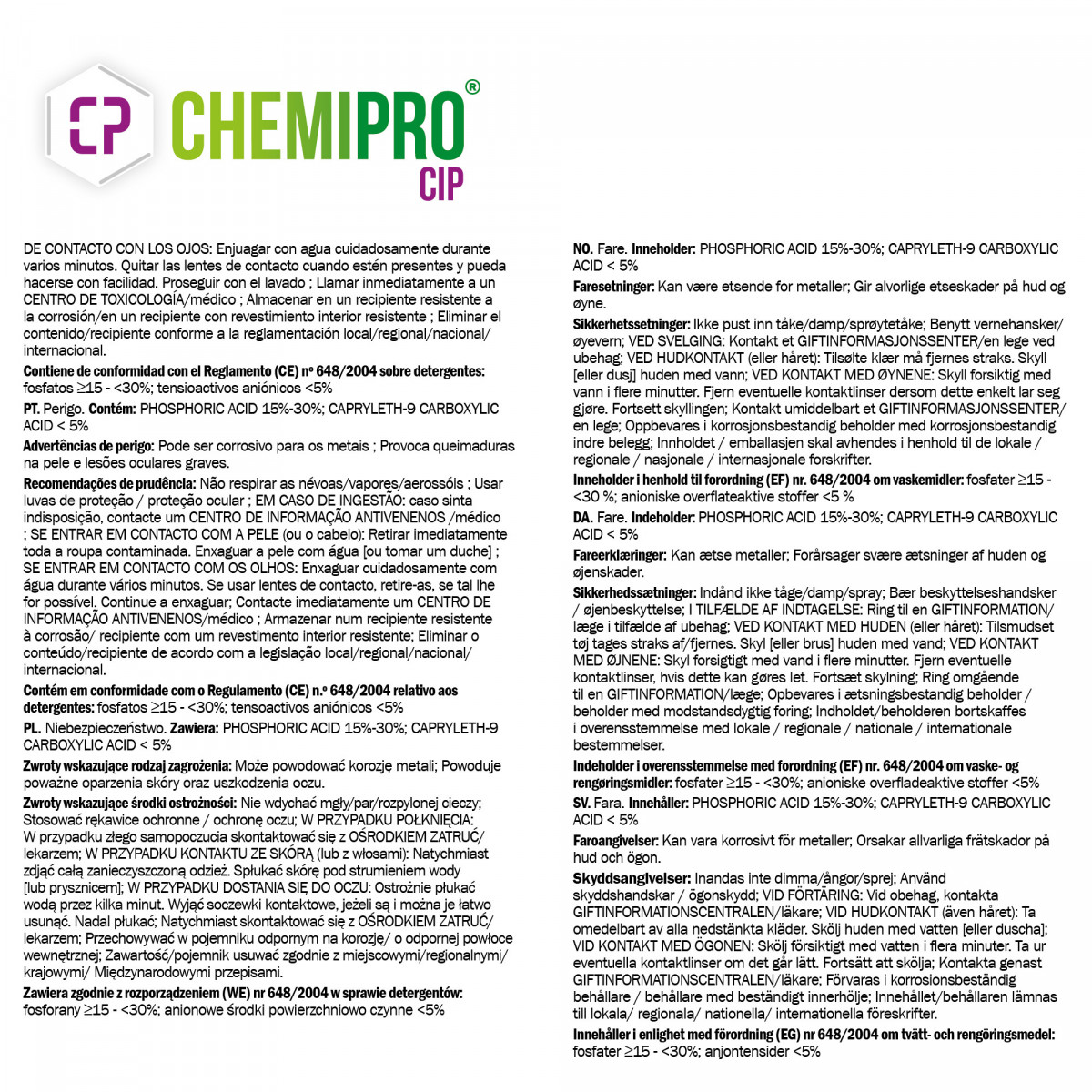 Käyttöohje: käytetään loppuhuuhteluna perusteellisen puhdistuksen jälkeen hyvällä emäksisellä pesuaineella, kuten Chemipro Washilla. Käytä 25–40 ml Chemipro CIP:tä 10 litraan vettä. Suihkuta tuote pinnalle tai anna sen liota vähintään 3 minuuttia. Huuhtele vain puhtaalla juomakelpoisella vedellä.