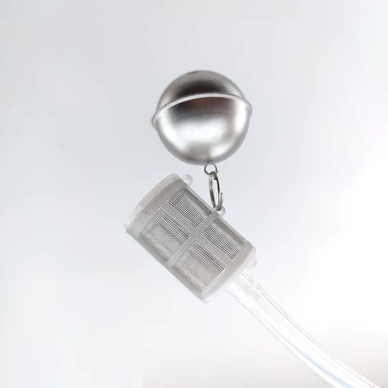 Fermzillan paineistussarjaan kuuluva kohopallo ja silikonilietku ja suodatin. Pallo pysyy nesteen pinnalla, joten sillä voi annostella Fermzillan tankin yläosasta aina kirkasta nestettä. Helpottaa annostelua. Letkun pituus 80cm.