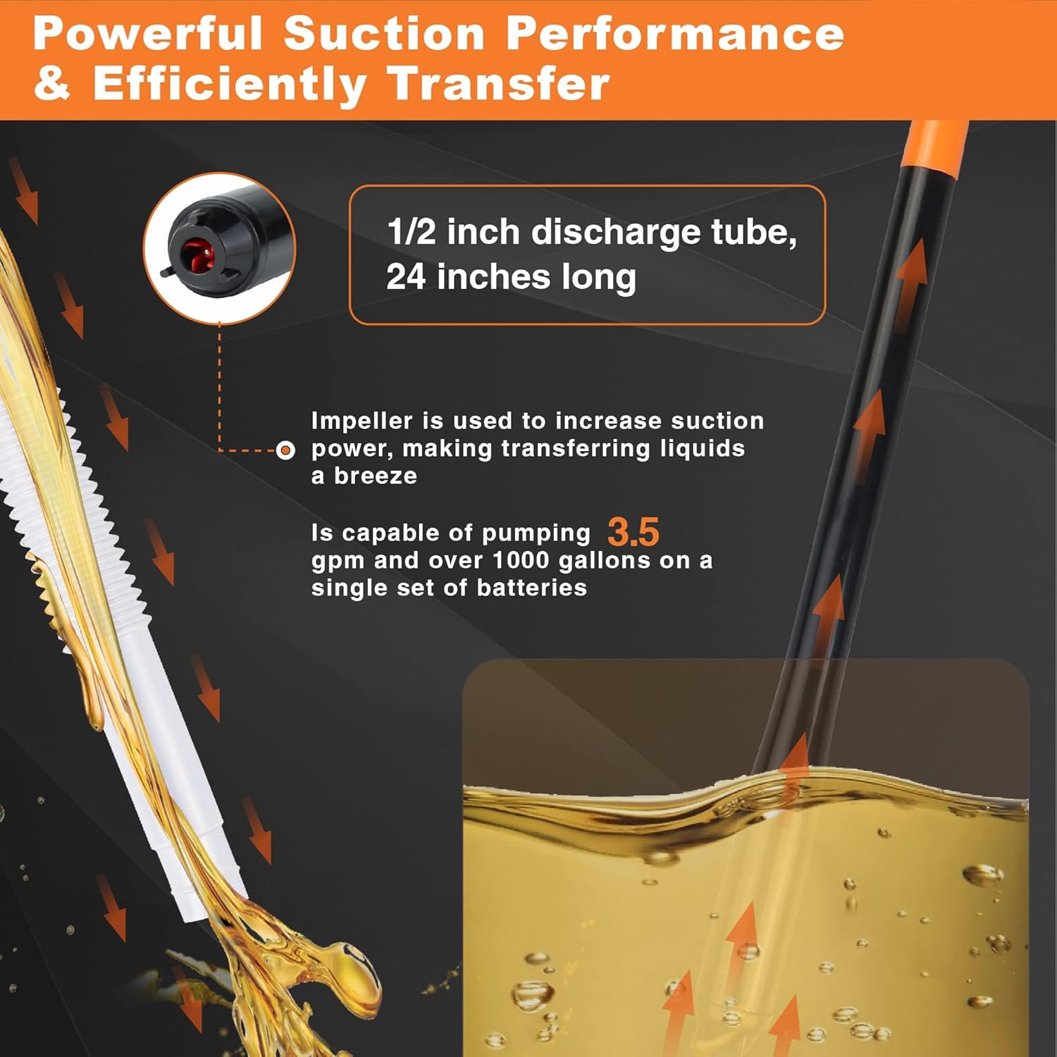 Nesteensiirtopumppu 1/2 tuuman ja 24 tuuman pituisella tyhjennysletkulla juoksupyörää käytetään imutehon lisäämiseen, mikä tekee nesteiden siirtämisestä helppoa. Se pystyy pumppaamaan 2.6 gpm ja yli 1000 gallonaa yhdellä paristosarjalla.