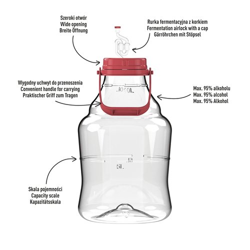 Täydellinen ratkaisu sekä kokeneille että aloitteleville viinin- tai muun juoman valmistajille. Ei enää ongelmia täysien demijohnien kanssa, jotka on parempi jättää siirtämättä. Ergonomisen, kestävän kahvan ansiosta voit kantaa demijohnia mukavasti, vaikka se olisi täynnä. Demijohn on läpinäkyvä, minkä ansiosta sen sisällä tapahtuvaa käymisprosessia on mahdollista seurata ja valvoa.